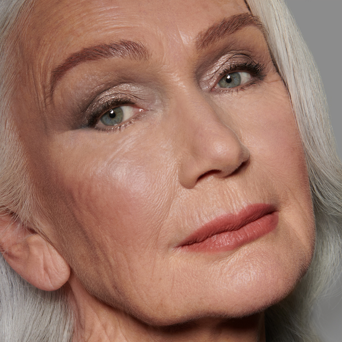 De grå och taupefärgade nyanserna skapar en naturligt definierad 90-tals supermodell-look, som enkelt kan byggas upp till en klassisk smoky eye.